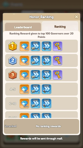 - Leaderboard rewards awarded to the top 100 players on your server with the highest points, which include gems and speedups.