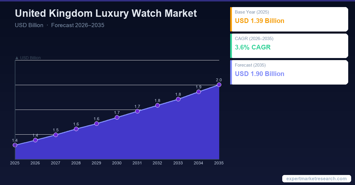 The United Kingdom Luxury Watch Market reached a value of approximately USD 1.39 Billion in 2025 and is projected to grow at a CAGR of 3.20% between 2026 and 2035, reaching around USD 1.90 Billion by 2035. The steady expansion reflects sustained consumer demand for premium timepieces and evolving retail dynamics across the country.