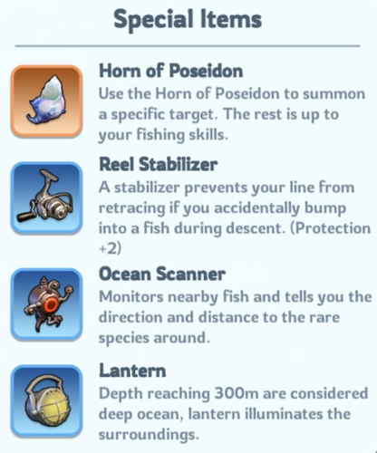 It also supplies 200 Fishing Tokens, an Ocean Scanner, Lantern, and Reel Stabilizer.