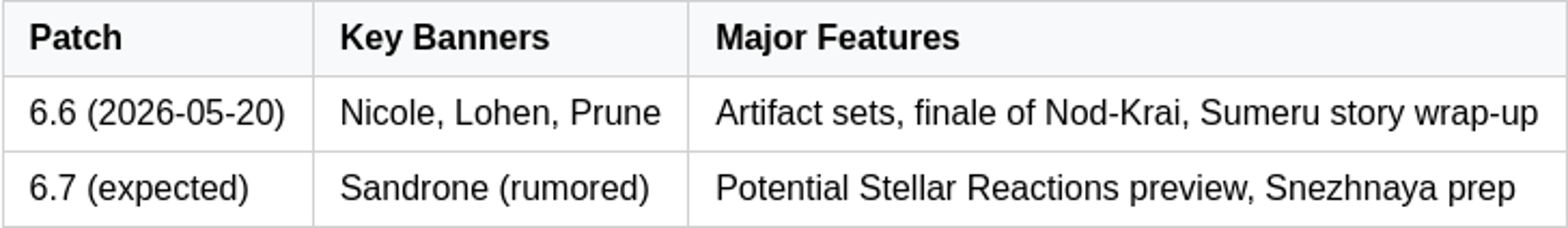 Version 6.6 (scheduled for May 20, 2026) appears to focus on new characters and major story conclusions for Nod-Krai and Sumeru, with Nicole, Lohen, and Prune named in test data as part of this release.