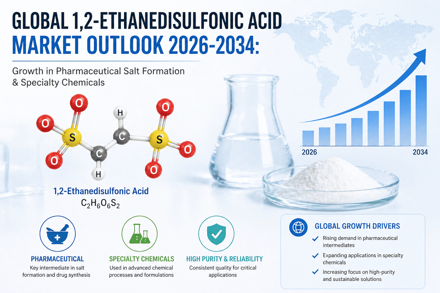 1. Rising Demand from Pharmaceutical Synthesis and API Manufacturing: The 1,2-Ethanedisulfonic acid market is experiencing steady growth, driven primarily by its critical role as a counterion in active pharmaceutical ingredient (API) salt formation. Salt selection is a fundamental step in drug development, and ethanedisulfonic acid — commercially known as edisylate — has become a preferred choice for improving the solubility, stability, and bioavailability of poorly water-soluble drug compounds. Several commercially approved medications are formulated as edisylate salts, reinforcing the compound's established utility in regulated pharmaceutical manufacturing environments. As the global pharmaceutical industry continues expanding its pipeline of small-molecule drugs, demand for high-purity specialty acids such as 1,2-ethanedisulfonic acid is expected to remain firm. The pharmaceutical salt formation segment remains the single largest end-use driver, with edisylate salts featuring in approved drug formulations across cardiovascular, neurological, and anti-infective therapeutic categories.