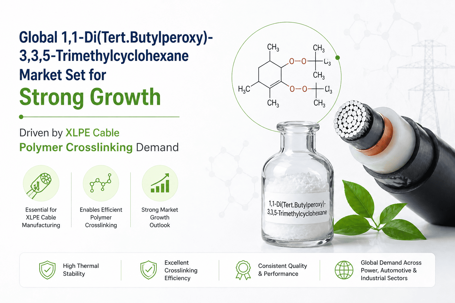 Expanding Polymer and Rubber Industry Fueling Demand: 1,1-Di(Tert.Butylperoxy)-3,3,5-Trimethylcyclohexane is positioned directly within one of the most expansive and structurally resilient segments of the specialty chemicals industry. Its primary role in the vulcanization of rubber and the crosslinking of polyethylene and ethylene-vinyl acetate copolymers places it at the heart of value chains serving the automotive, construction, wire and cable, and consumer goods sectors. The global polymer and rubber manufacturing industry has maintained consistent expansion, driven by rising infrastructure investment across emerging markets and sustained demand for high-performance engineered materials in developed economies. As manufacturers pursue materials with improved thermal stability, superior mechanical strength, and longer service lifespans, the importance of efficient crosslinking agents like this bifunctional peroxide has only grown. Its one-hour half-life at approximately 130–135°C makes it particularly well-suited to the processing temperature windows common in polyolefin and rubber compounding operations, reducing scorch risk while maintaining effective crosslink formation.