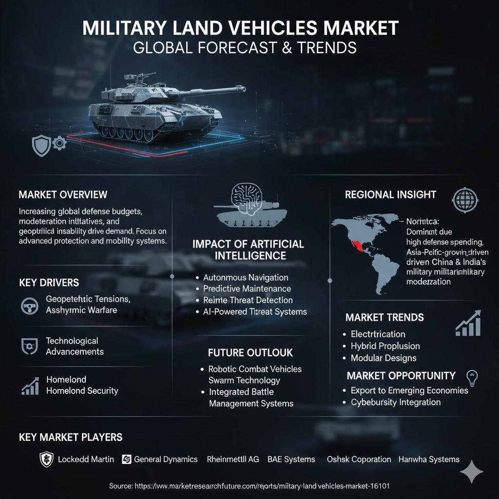 This Military Land Vehicles Market Analysis highlights the strategic importance of land-based platforms in modern warfare. As battlefields become increasingly complex, military vehicles must combine protection, mobility, and intelligence to ensure mission success.