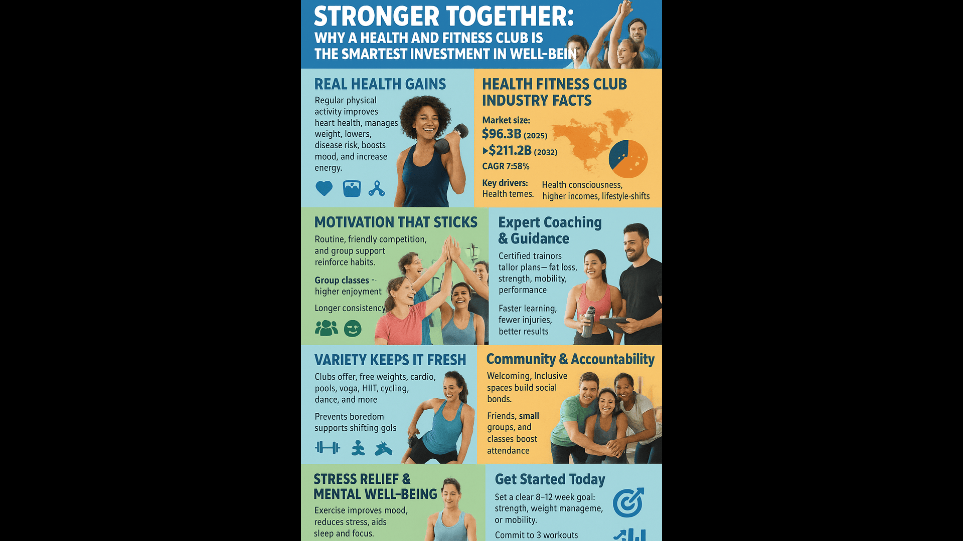 Key trends include digital fitness adoption, hybrid training models, community-based programs, and rising demand for personalized coaching services.