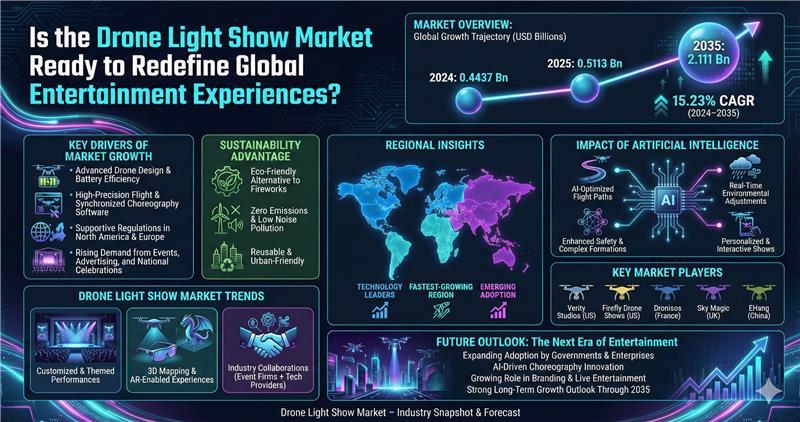The Drone Light Show Market is emerging as a disruptive force within the global live entertainment and advertising ecosystem. Drone-based aerial performances are rapidly replacing conventional fireworks due to their programmable precision, environmental benefits, and ability to deliver immersive brand storytelling at scale.